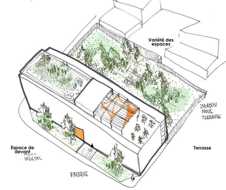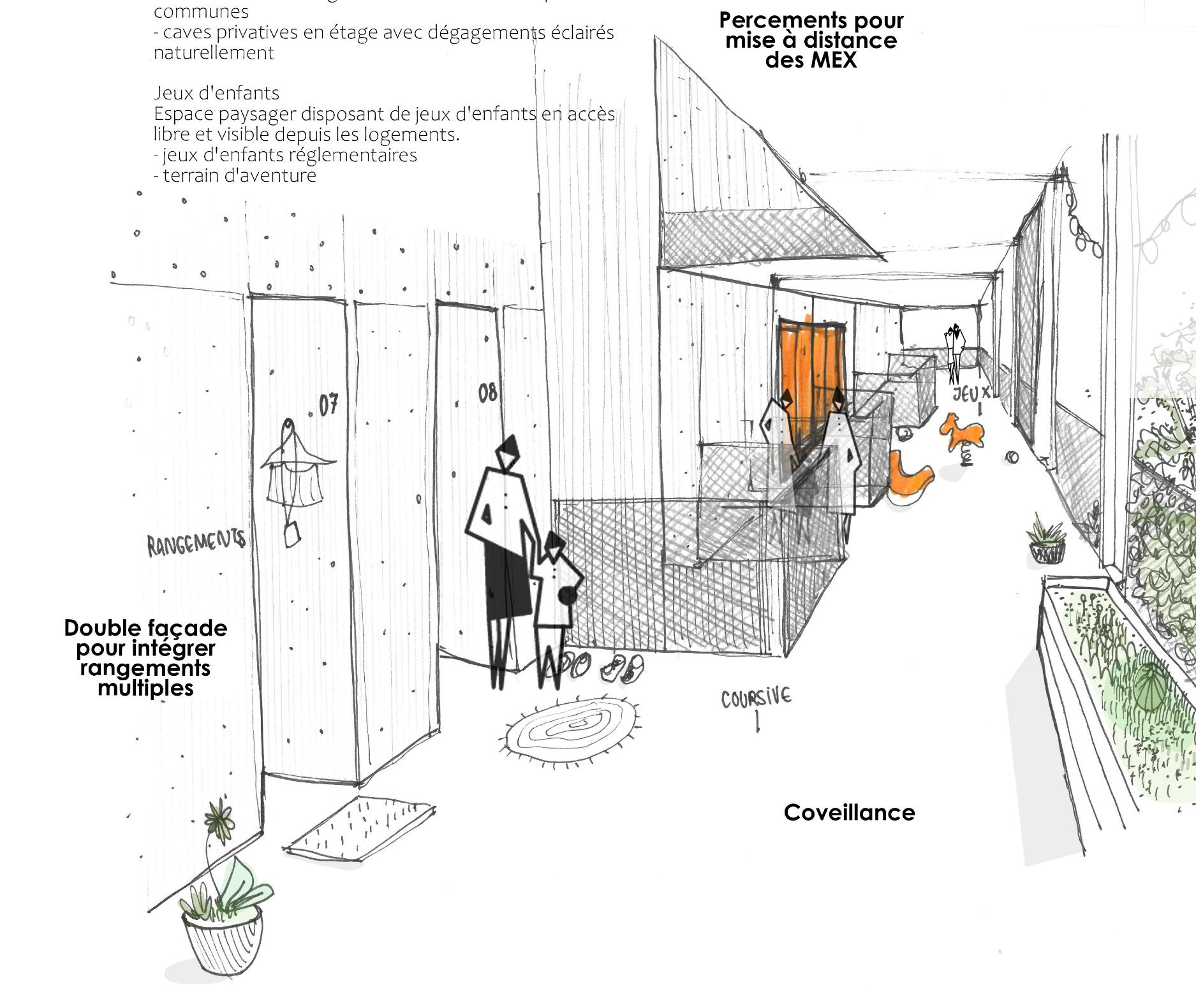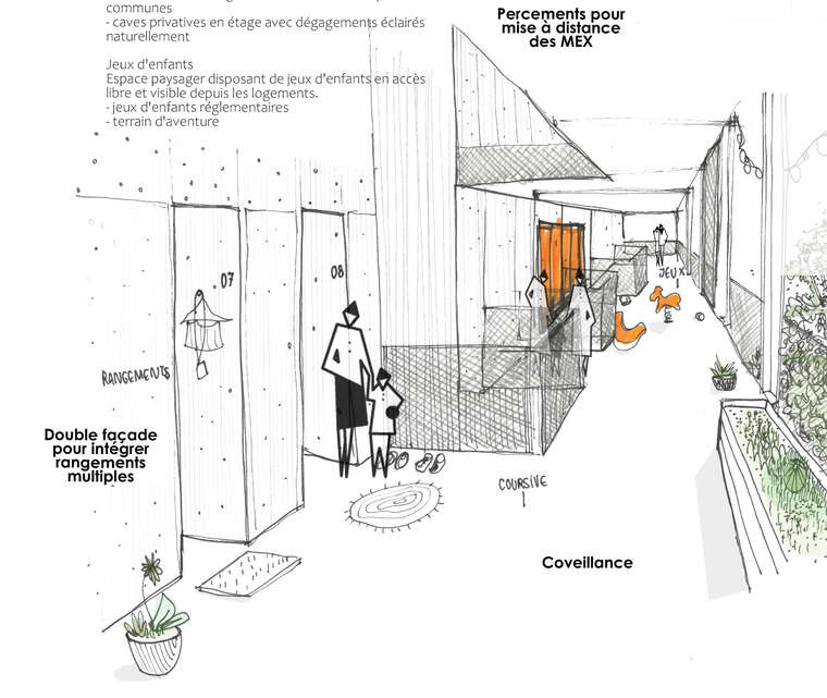 Dans cette résidence, les parties communes ne sont pas accessoires : elles servent la stratégie sociale. La programmation prévoit notamment une salle de convivialité, une buanderie collective, des jardins communs et des coursives pensées comme des espaces appropriables.